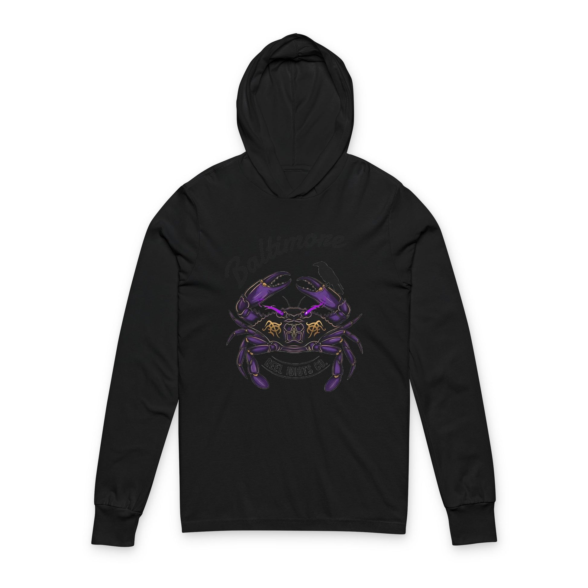 A dark and witty hoodie inspired by the Baltimore t-shirt from the Reel Idiots Co "Hometown Catch" collection. Featuring a menacing Maryland Blue Crab with glowing purple eyes and a Raven, this design captures the dark, poetic, and intimidating spirit of Baltimore football. Perfect for fans who appreciate a touch of mystery in their victory.